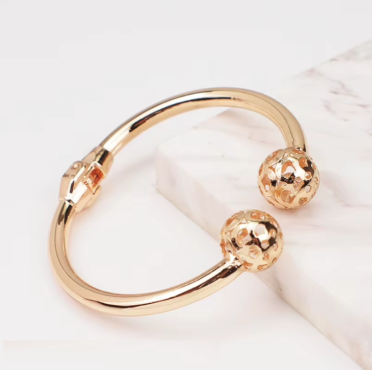 ✨ Sublimez votre poignet avec ce bracelet doré ouvert orné de deux boules sculptées effet bijou de luxe.
