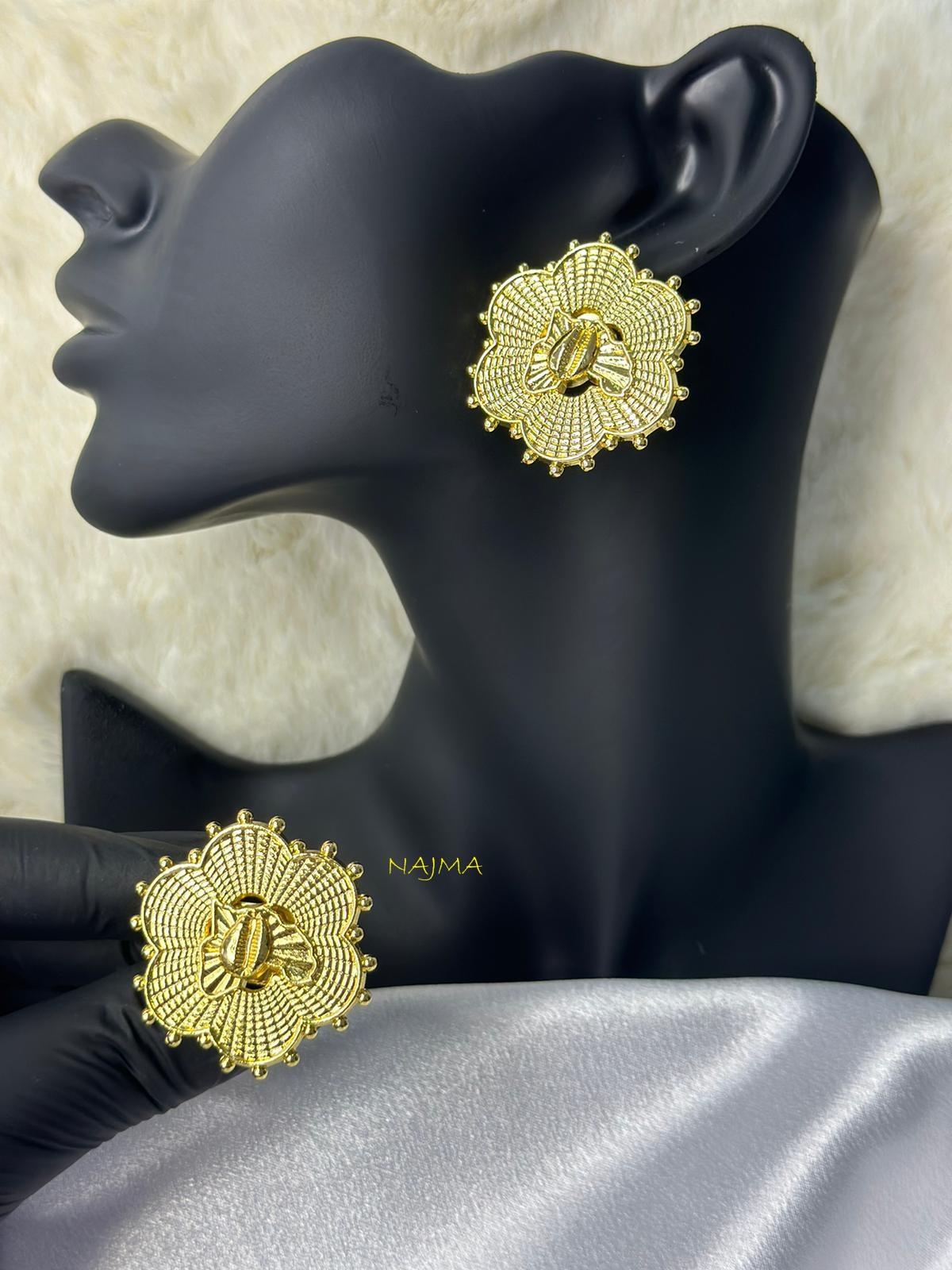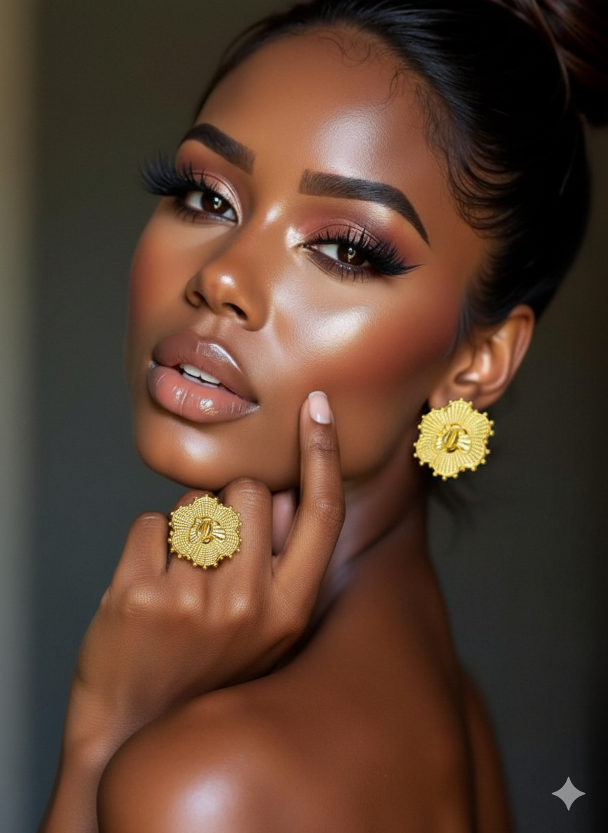 L’ensemble NAJMA célèbre la féminité et la puissance des cultures africaines. Sa forme de fleur sculptée, ornée d’un coquillage central, en fait un bijou à la fois culturel, luxueux et intemporel. Une pièce forte qui sublime instantanément aussi bien une tenue moderne qu’un look traditionnel.