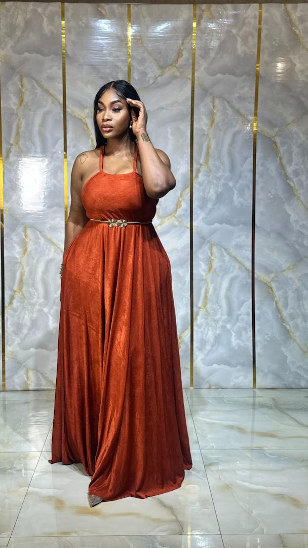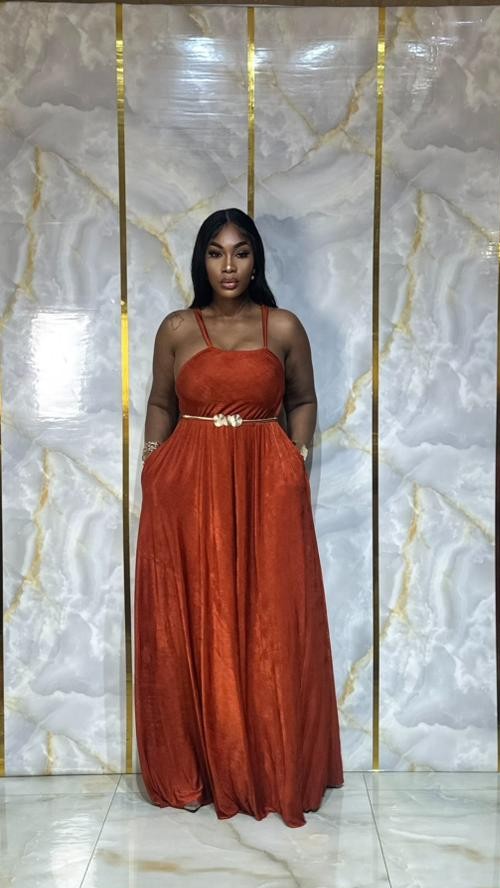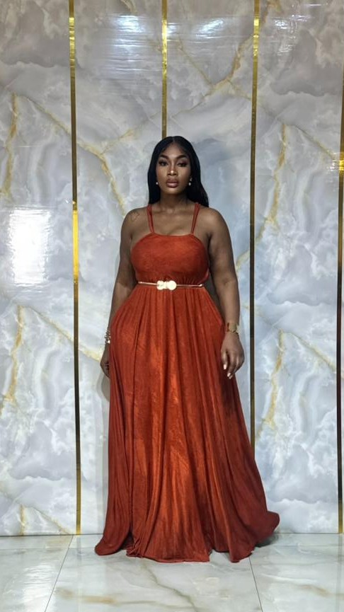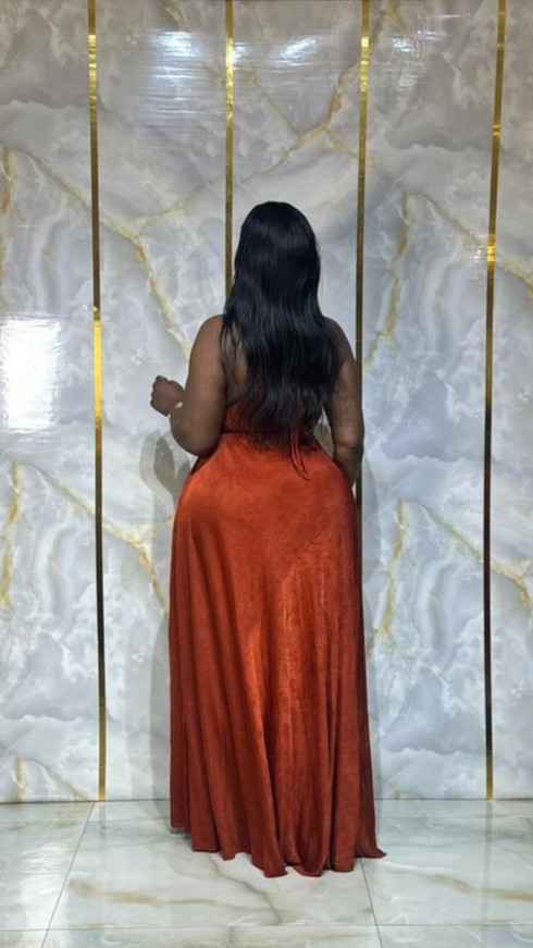 Sublimez votre allure avec cette magnifique robe longue fluide en tissu doux et satiné, d’une élégante teinte terracotta. Sa coupe évasée met en valeur la silhouette tout en apportant confort et légèreté.