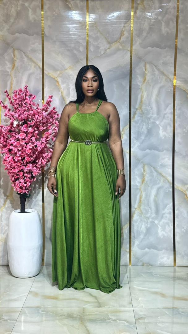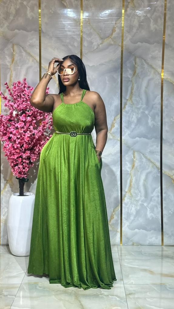 Le haut à bretelles fines souligne délicatement les épaules, tandis que la ceinture dorée vient marquer la taille pour une touche féminine et raffinée.